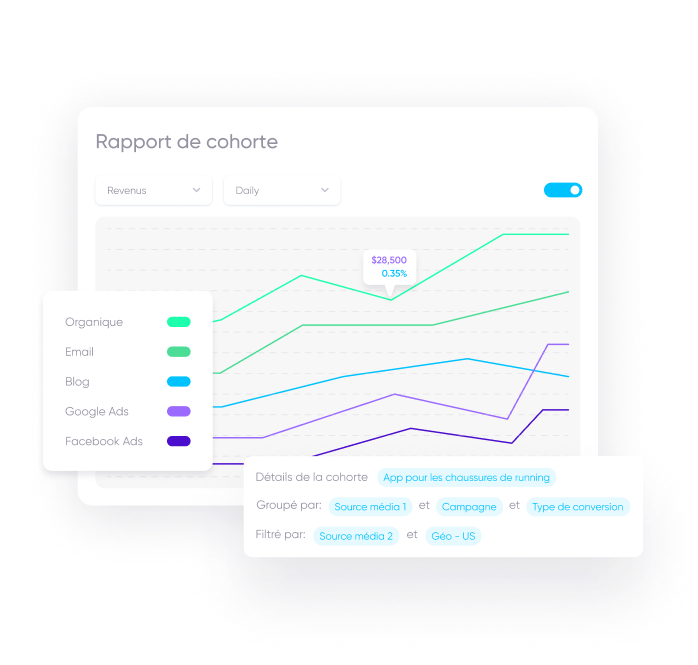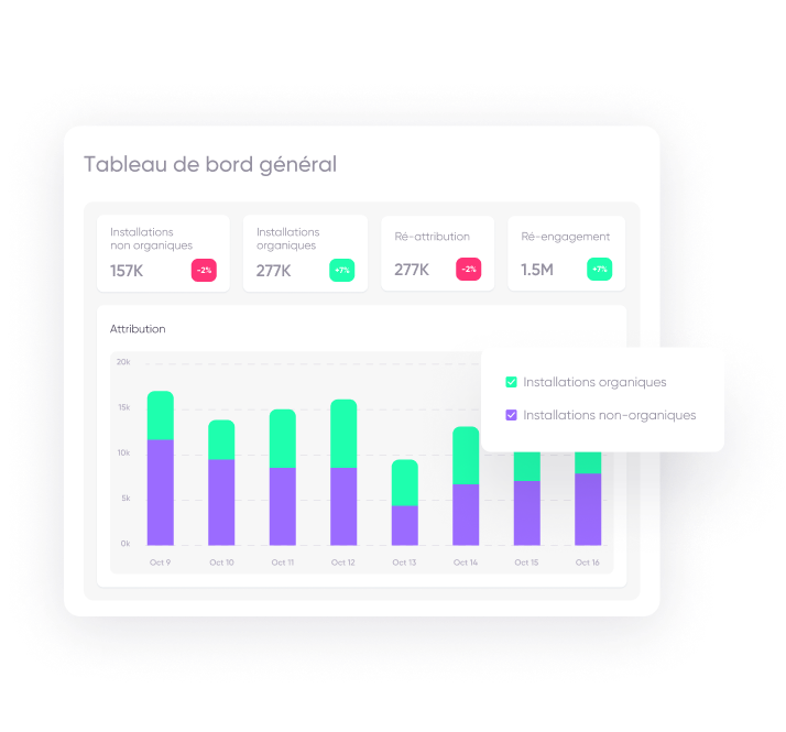 Si vous souhaitez atteindre vos indicateurs clés de performance marketing, les données sur lesquelles vous vous appuyez se doivent d’être précises et faciles à comprendre. Nos outils d’analyse mobile ont justement été conçus pour vous apporter les informations dont vous avez besoin pour stimuler les conversions, améliorer la fidélisation des clients et augmenter les revenus.